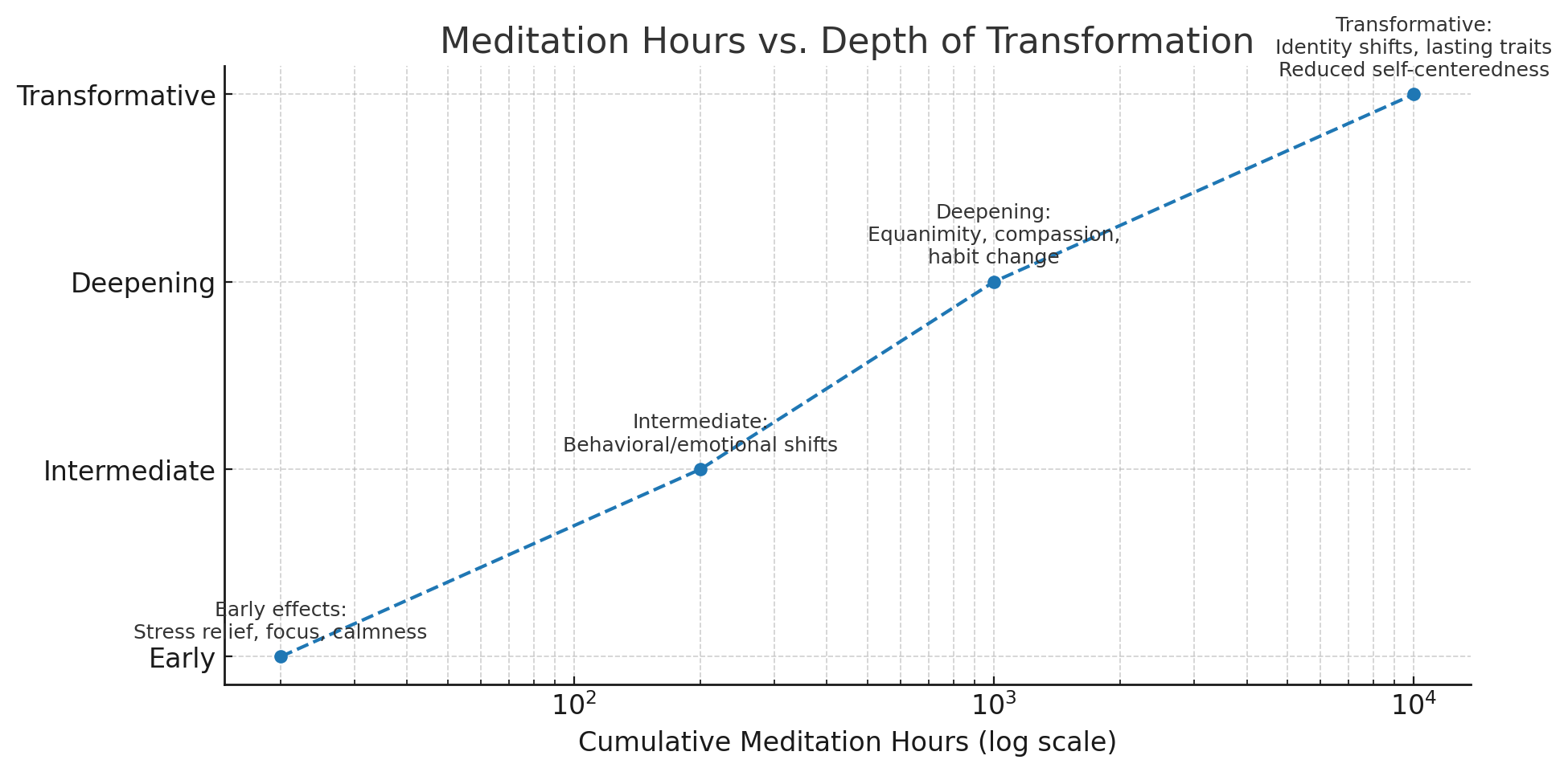 There is always resistance when it comes to learning from the masters in a week long meditation camp who sometimes employ extremely harsh pain inflicting teaching techniques. Not only does the learning sound difficult but the continued practice of it makes it an even more daunting affair. Meditation is purely a game of cumulative lifetime hours. Some research is available to demonstrate that the initial ‘awakening’ happens in the first 30 hours with apparent reduction of stress and anxiety levels and with advanced practice of over 10,000 hours leads to a fundamental shift in the idea of one’s self and identity.
